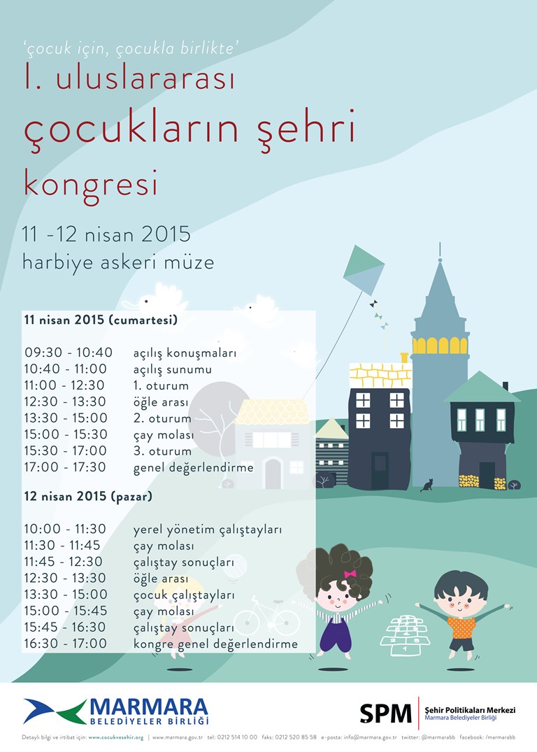 11 – 12 Nisan 2015 tarihlerinde Harbiye Askeri Müzesi’nde gerçekleştirilecek olan 1. Uluslararası Çocukların Şehri Kongresi ile ilgili detaylara ulaşmak için www.cocukvesehir.org adresini ziyaret edebilirsiniz.