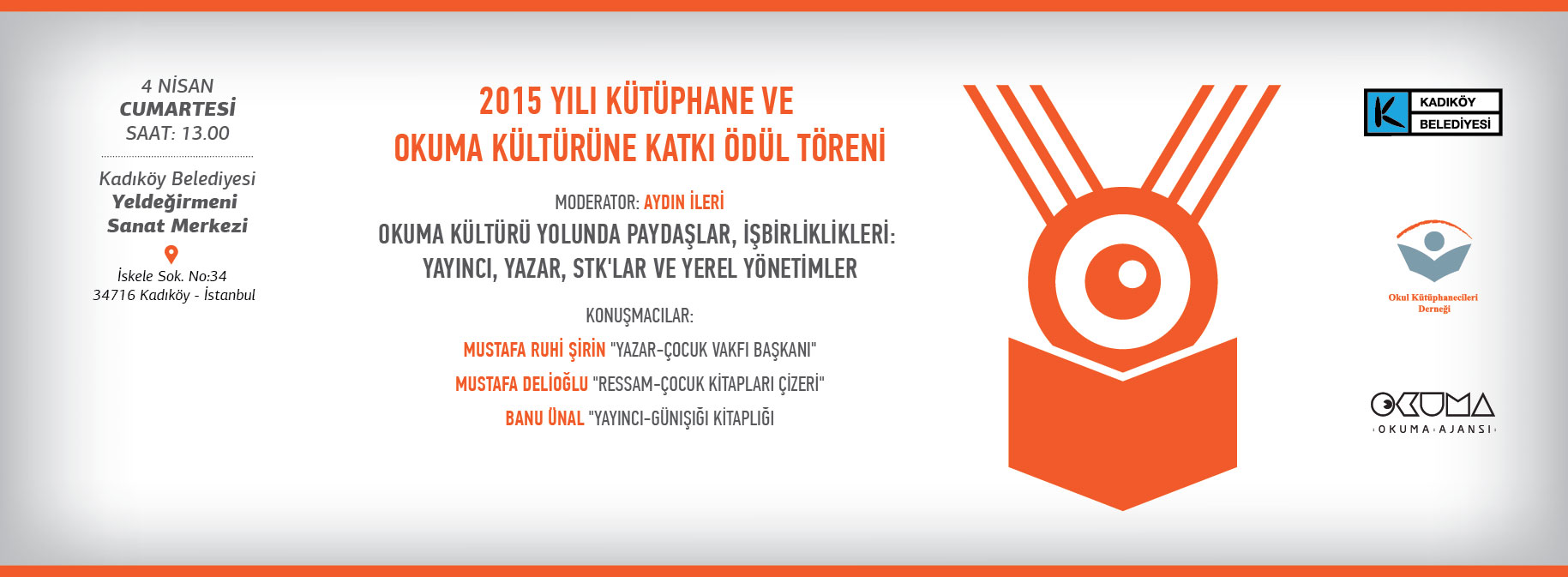 4 Nisan 2015 Cumartesi günü saat 13.00’da Kadıköy Belediyesi Yel değirmeni Sanat Merkezi’nde gerçekleşecek olan Kütüphane ve Okuma Kültürüne Katkı Ödül Töreni’ne edebiyat, kültür sanat ve okuma kültürü ile ilgilenen herkes davetli.