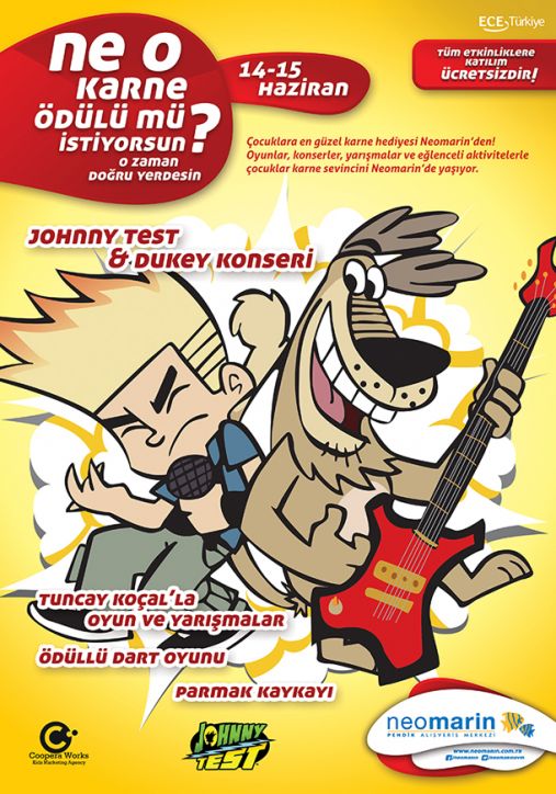 İyilerin dostu, kötülerin azılı düşmanı Johnny Test, 14 ve 15 Haziran’da, 14:00 – 20:00 saatleri arasında Pendik Neomarin Alışveriş Merkezi’nde tüm gün süren konserlerle çocuklara güzel bir karne hediyesi verecek.