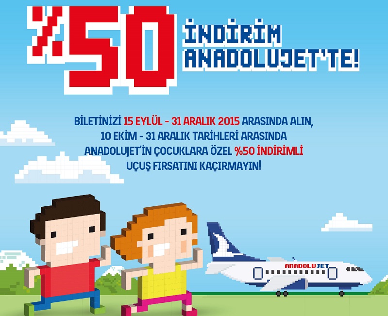 AnadoluJet tarafından çocuklara yönelik olarak başlatılan kampanya ile 15 Eylül ile 31 Aralık 2015 tarihleri arasında alınan ve 10 Ekim – 31 Aralık tarihlerini kapsayan uçuşlar için %50 indirim yapılacak.