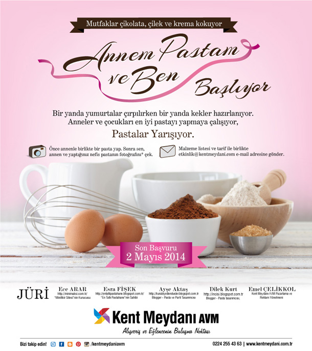 Jürisinde Parti ve Pasta Tasarımcısı blogger Ayşe Aktaş, En Tatlı Pastane’nin sahibi Esra Fişek, Pasta Tasarımcısı blogger Dilek Kurt, Kent Meydanı AVM Pazarlama ve Reklam Yönetmeni Emel Çelikkol ile Anne-Çocuk Kitapları yazarı Ece Arar’ın yer aldığı Annem, Pastam ve Ben yarışmasına son katılım tarihi 2 Mayıs 2014 olarak belirlendi.