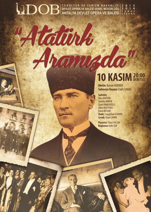 Atatürk’ün fotoğraflarından seçilmiş bir slayt ve video gösteriminin de sunulacağı gecede Ebru KAPTAN, Semiha BORAN, Zişan DAMCIOĞLU, Oben BOSTANCI ve Emre AKYURT solist olarak sahne alırken, “dede” rolünde Toygarhan ATUNER, “torun” rolünde ise Kayra ŞANAL seyirci karşısına çıkacak. Aynı zamanda piyanoda Yücel YALÇIN ve bağlamada Halis IŞIK sanatçılara eşlik edecek. Bu müzikli anlatı 10 Kasım Pazar akşamı saat: 20.00’da Haşim İşcan Kültür Merkezi’nde ücretsiz sahnelenecek.