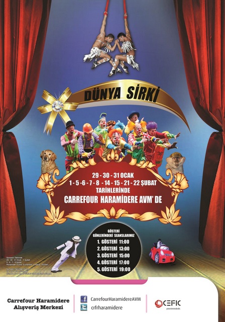 Dünya Sirki Carrefour AVMDünya Sirki gösterisinde; hava akrobasi performansı, illüzyon gösterileri, palyaçolar, dev piton yılanları, dans gösterileri gibi birçok performans sergilenecek. Çocukları hem şaşırtacak hem de heyecanlandıracak gösterilere ev sahipliği yapmayı hedefleyen Carrefour Haramidere AVM  günde 5 seans ile çocukların karşısında olacak.