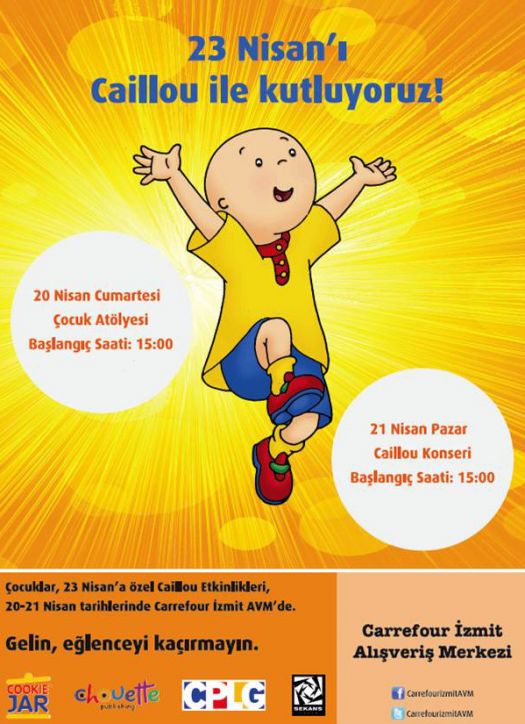 Türkiye’de ve dünyada yayınlandığı ülkelerde çocukların büyük ilgi ile izlediği çizgi film karakteri Caillou,Carrefour İzmit AVM'nin 23 Nisan etkinlikleri kapsamında çocuklarla birlikte olacak.