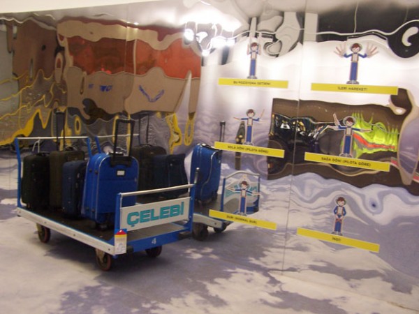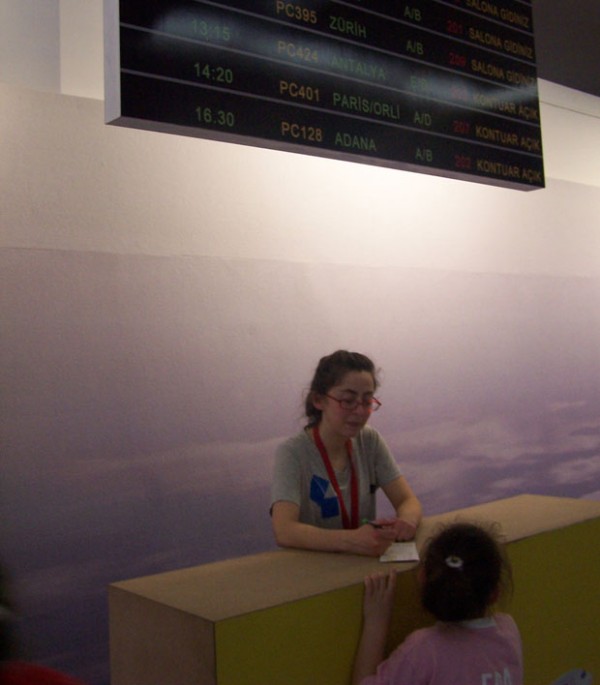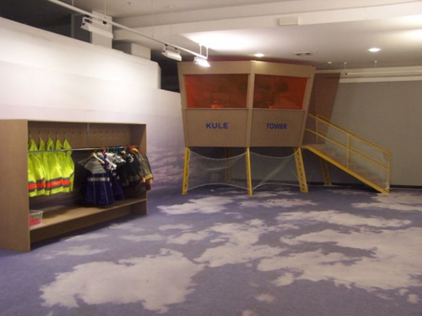 Uçak içerisindeki izlenimlerin ardından, çocuklar yer görevlisi olabiliyor, bu alanda askıda bulunan kıyafetleri giyerek, kontrol kulesinin yardımıyla, uçakları yönlendirmeyi öğreniyorlar.