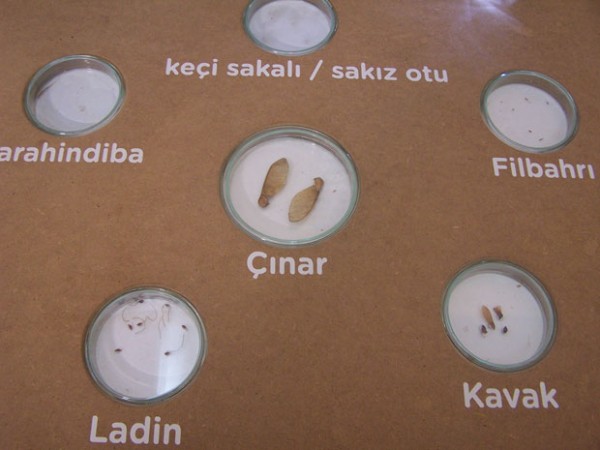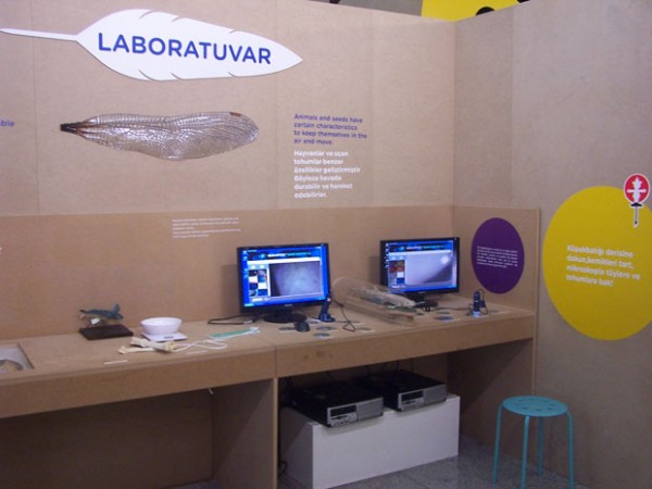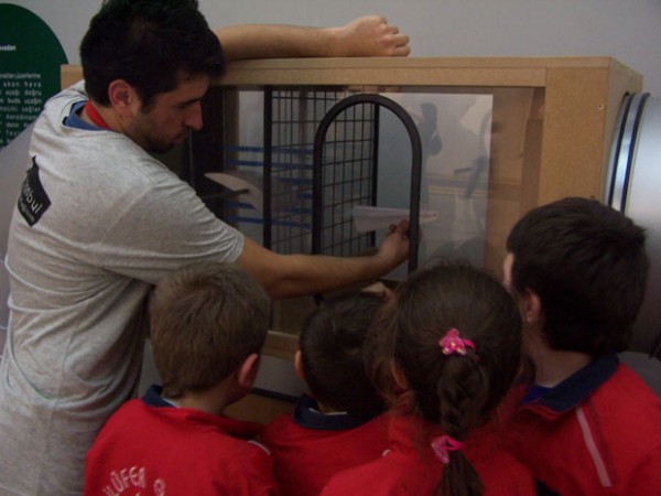 Doğa bölümüne gelen çocuklar, doğadaki uçan nesneleri yakından izleme şansı buluyor, bir mikroskop yardımı ile görünümlerini yakından gözlemliyorlar.