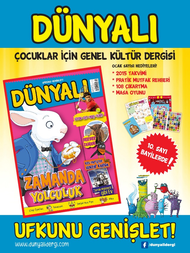 Dünyalı Dergi 10. sayısı ile Ocak ayında çocuklarla buluşacak. Ocak sayısında, çocuklara özel hediyeler ile gelen Dünyalı Dergi; 2015 masa takvimi, lezzetli tariflerin yer aldığı Pratik Mutfak Rehberi ve 108 adet renkli çıkartma ile çocuklara sunulacak.