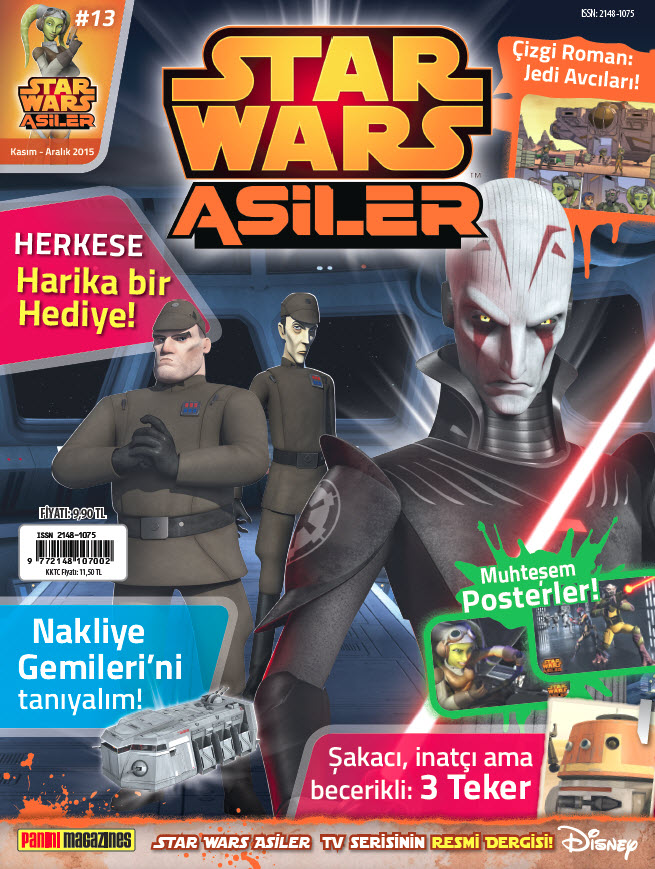 Star Wars Asiler Dergisi, Kasım-Aralık 2015 sayısı ile 2016’ya girmeden önceki son sayısını okuyucularıyla buluşturuyor. Jedi Avcıları çizgi romanın yer aldığı dergide, Nakliye Gemileri de yakından inceleniyor. Şakacı, inatçı ama becerikli 3 Teker’i yakından tanımak isteyenler için de dergide özel bir bölüm yer alıyor. “Muhteşem Posterler”in yanı sıra, “Herkese Harika Bir Hediye” de Star Wars Asiler Kasım Aralık 2015 sayısında.