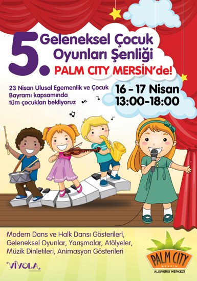 23 Nisan etkinlikleri kapsamında her yıl Mersin’nde gerçekleştirilen Geleneksel Çocuk Oyunları Şenliği’nin beşincisi bu yıl 16 – 17 Nisan 2016 tarihleri arasında Mersin Palm City Alışveriş Merkezi’nde çocuklarla buluşacak. Şenlikte geleneksel oyunlar, dans gösterileri, yarışmalar, atölye etkinlikleri, müzik dinletileri ve sürpriz etkinlikler çocuklarla bir araya gelecek.