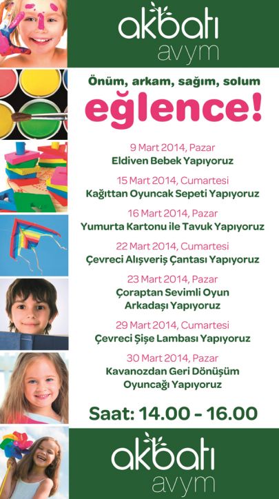 Akbatı atölye çalışmaları Mart ayında da hafta sonları 14:00-16:00 saatleri arasında Akbatı AVYM 1.Kat’ta gerçekleştirilecek. Eğlendirirken çocukların zihinsel ve motor gelişimine de katkı sağlaması hedeflenen programda “Eldiven Bebek Yapıyoruz”, “Çevreci Şişe Lamba Yapıyoruz”, “Kavanozdan Geri Dönüşüm Oyuncağı Yapıyoruz” gibi keyifli atölyeler yer alıyor.