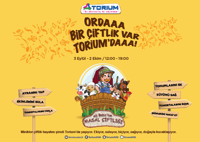 Torium AVM, eylül ayı boyunca çocukları masal çiftliği ile buluşturacak. Ali Baba’nın Masal Çiftliği etkinliği ile çocuklar, tarım ve doğa hakkında bilgi sahibi olacağı gibi, interaktif atölye çalışmalarına da katılacak.