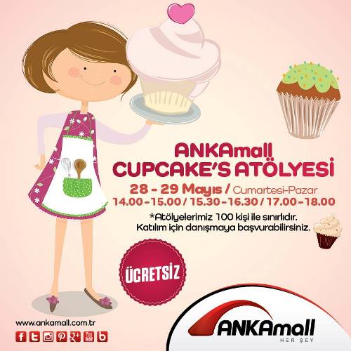 ANKAmall Cupcake’s Atölyesi, Mayıs ayında ANKAmall Alışveriş Merkezi’nde çocuklarla buluşacak. Etkinlik kapsamında çocuklar, hayallerindeki cupcakeleri hazırlayacaklar. ANKAmall Cupcake’s Atölyesi, 28 Mayıs Cumartesi ve 29 Mayıs Pazar günü 14.00-15.00, 15.30-16.30, 17.00-18.00 saatleri arasında ücretsiz olarak çocuklarla gerçekleştirilecek.