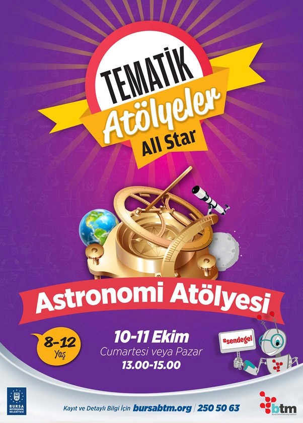 Bursa Bilim ve Teknoloji Merkezi tarafından düzenlenen Astronomi Atölyesi, çocukların gezegenler, Dünya, Güneş Sistemi hakkında bilgi sahibi olmasını sağlayacak.