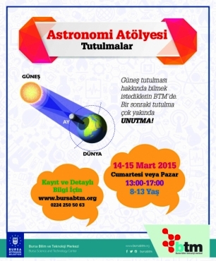 Astronomi Günü Tutulmaları, Mart ayında Bursa Bilim ve Teknoloji Müzesi’nde çocuklarla buluşacak. Etkinik kapsamında çocuklar ısı ve ışıl kaynağımız olan güneşi öğrenip, Güneş nasıl tutuluyor ve neden farklı şekillerde farklı yerlerde tutuluyor? Bir sonraki güneş tutulmasını izlemek için neler yapmak gerekiyor? sorularının cevaplarını kavrayacaklar. Minik bilim severler bu soruların ve daha fazlasının cevaplarını bulacaklar. Kim bilir belki bir sonraki tutulma sandığımızdan daha yakın.