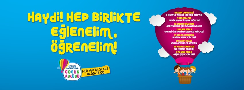 Forum Kapadokya AVM, Nevşehir çocuk etkinlikleri kapsamında, kasım ayı boyunca çocuklar için birbirinden farklı atölye ve etkinlikler düzenliyor. Her hafta sonu saat 14.00 ile 17.00 arasında gerçekleştirilecek olan etkinliklere, her yaştan çocuk katılabilecek. Nevşehir çocuk etkinlikleri kapsamında düzenlenecek olan atölye ve etkinlik çalışmalarının tümü ücretsiz olacak.