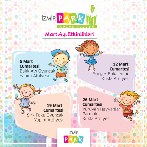 İzmir Park Alışveriş Merkezi, birbirinden farklı çocuk atölyelerini Mart ayı boyunca çocuklarla buluşacak. Çocukların eğlenirken öğrenebilmelerini amaçlayan çocuk atölyeleri, 3 seans olarak 14.00, 15.30 ve 17.00 saatlerinde çocuklarla bir araya gelecek.