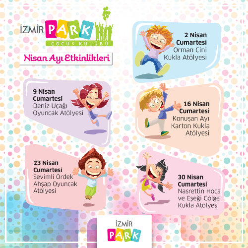 İzmir Park Alışveriş Merkezi, Nisan ayı boyunca birbirinden farklı çocuk atölyeleri ile çocuklarla buluşacak. Çocuk atölyeleri 3 seans şeklinde 14.00, 15.30 ve 17.00 saatlerinde çocuklarla gerçekleşecek. Alışveriş merkezinin danışma biriminden form doldurarak atölyelere katılabilirsiniz. Atölyelere katılım 20 kişi ile sınırlı tutulmaktadır.