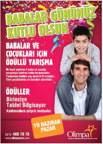 Babalar ve Çocukları İçin Ödüllü Yarışma, Haziran ayında Olimpa Alışveriş Merkezi’nde çocuklarla buluşacak. Yarışma, Babalar Günü’ne özel olarak gerçekleştirilecek. Babalar ve Çocukları İçin Ödüllü Yarışma’ya 6 baba ve çocuk katılma fırsatını yakalayacaklar. Yarışmada birinci tablet bilgisayar kazanacaklar. Üstelik katılımcılara sürpriz hediyeler verilecek.