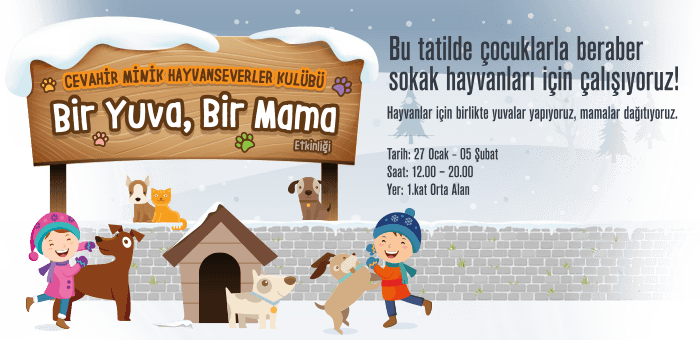 AVM sömestr etkinlikleri kapsamında İstanbul Cevahir Alışveriş Merkezi tarafından düzenlenen Bir Yuva Bir Mama etkinliği çocuklarla buluşacak. Saat 12.00’dan 20.00’a kadar devam edecek olan etkinlikte, çocuklar sokak hayvanları için yuva yapacak ve mama dağıtacaklar.