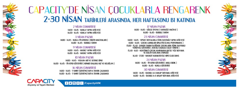 23 Nisan Ulusal Egemenlik ve Çocuk Bayramı kapsamında gerçekleştirilecek olan etkinlikler ile Capacity AVM, tüm nisan ayı boyunca çocuklar için yaratıcı ve eğlenceli etkinlikler düzenliyor. Etkinliklere tüm çocuklar ücretsiz olarak katılabiliyor.