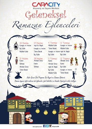 Capacity Alışveriş Merkezi içerisinde özel Ramazan dekoru eşliğinde gerçekleşecek olan etkinlikler; 20 Haziran Cumartesi günü başlayıp 12 Temmuz Pazar gününe kadar her Cumartesi ve Pazar günleri 14.00 – 17.00 saatleri arasında Capacity AVM ziyaretçileri ile buluşacak.