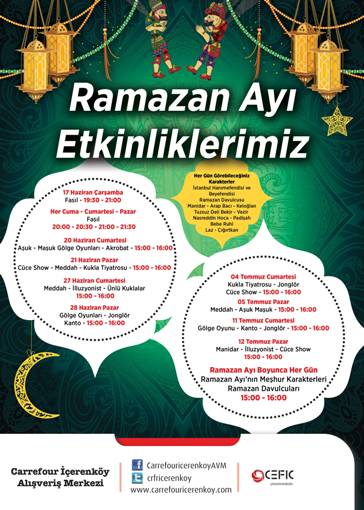 Ramazan ayı boyunca Carrefour İçerenköy AVM’de her Cuma – Cumartesi ve Pazar günleri gerçekleşecek Aşuk ve Maşuk Gölge Oyunları, Orta Oyunu, Meddah, Kukla Tiyatrosu, Akrobat, İllüzyonist, Jonglör, Kanto gösterileri yapılacak.