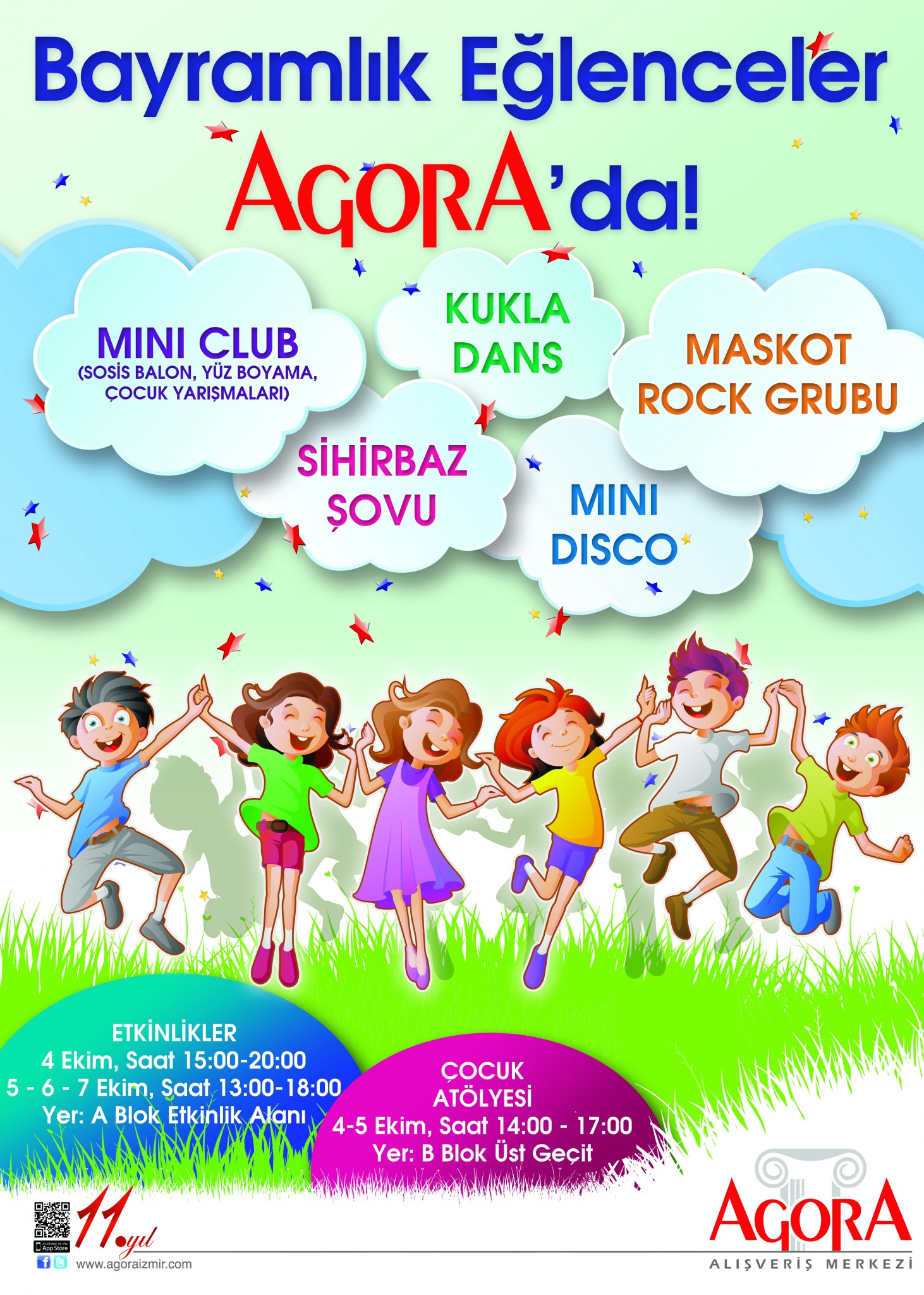 Agora AVM’nin 4-7 Ekim tarihleri arasında düzenleyeceği etkinlikler kapsamında çocuklar, Mini Club’ta Sosis Balon ve Yüz Boyama aktiviteleriyle farklı karakterlere bürünecek; çocuk yarışmalarıyla eğlenceli vakit geçirecekler. Maskot Rock grubunun konserleriyle şenlenecek etkinlikler boyunca minikler, Sihirbaz’ın merak uyandıran şovlarını heyecanla seyredecek, Mini Disco’da koreograf eşliğinde dans figürleri öğrenecekler.