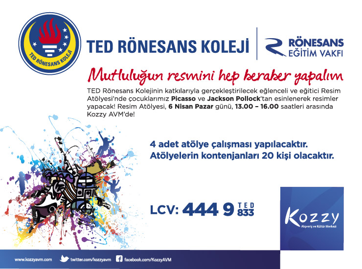 Çocuklar Mutluluğun Resmini Kozzy’de Çiziyor Fiyat: ÜcretsizTED Rönesans Koleji tarafından düzenlenen "Mutluluğun Resmini Hep Beraber Yapalım" isimli atölye çalışmasında çocuklar, Picasso ve Jackson Pollock'ın eserlerinden yola çıkarak yapacağı resimlerle, mutluluk kavramını kağıtlara yansıtacak!