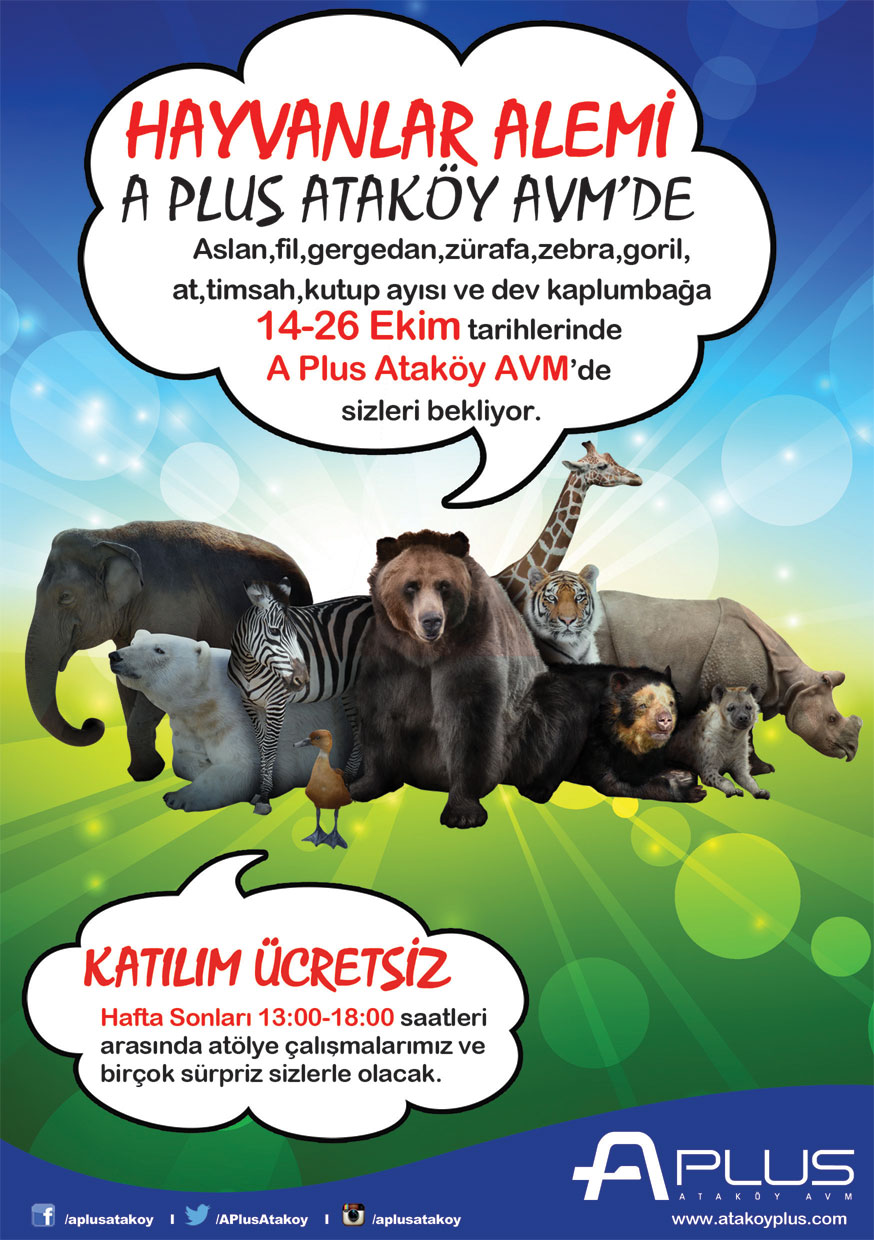 Aslan, fil, gergedan, zürafa, zebra, goril, at, timsah, kutup ayısı ve dev kaplumbağa gibi hayvanların dünyasının keşfedileceği “Hayvanlar Alemi Sergisi”, 14-26 Ekim 2014 tarihleri arasında A Plus Ataköy AVM’de olacak.