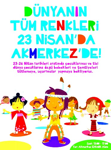 23 Nisan’ı özel bir etkinlik ile kutlamak isteyen Akmerkez 23-26 Nisan tarihleri arasında 7 kıtanın çocuklarını temsil eden süslemeler ile birlikte çocuklar eğlenceli bir etkinlik sunacak.