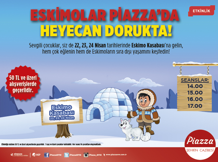 22, 23 ve 24 Nisan 2016 tarihleri arasında gerçekleştirilecek olan Eskimo Kasabası etkinlikleri kapsamında, çocuklar Eskimoların şaşırtıcı dünyaları ile tanışacaklar. Hem eski zamanlara dair hem de farklı hava koşulları ile ilgili fikir yürütecek olan çocuklar, akranlarıyla sosyalleşme ve 23 Nisan’ı kutlamak için bir araya gelecek.