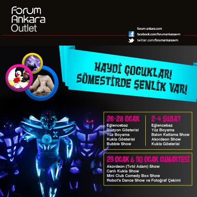 Forum Ankara Outlet, yarıyıl etkinlikleri kapsamında 23 Ocak Cumartesi ve 30 Ocak Cumartesi günleri saat 12.00’den 20.00’a kadar devam edecek. Çocuklar sömestir etkinlikleri ile çocuklara dopdolu bir hafta sonu yaşatmayı amaçlıyor. Etkinlik kapsamında şovlar 26 – 27 – 28 Ocak ve 2 – 3 – 4 şubat günleri de saat 16.00-18.00 arasında devam edecek.