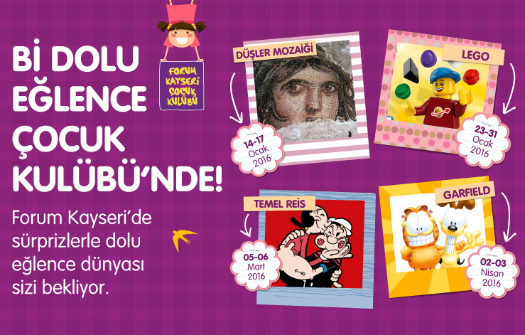 5-6 Mart 2016 tarihlerinde Temel Reis, 2-3 Nisan 2016 tarihlerinde Garfield, 22-24 Nisan 2016 tarihlerinde Kukla Festivali, 5-8 Mayıs tarihleri arasında Minyatür Evler ve 11-12 Haziran 2016 tarihleri arasında Roboland, Kayseri çocuk etkinlikleri kapsamında, Forum Kayseri AVM’de çocuklarla buluşacak.