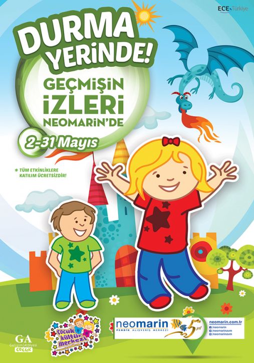 Yeni temasıyla 2-31 Mayıs arasındaki Cuma ve Cumartesi günleri 14.00-18.00 saatleri arasında açık kalacak olan Neomarin Çocuk Kültür Merkezi, 3-6 ve 7-14 yaş gruplarına ayrı kategoriler sunacak. Süreç boyunca, 3-16 yaş grubu, Kolaj ve Resim atölyelerine katılarak eğitmenleri ve akranlarıyla kültürel bir ortamı paylaşacaklar. 7-14 yaş grubu ise yine gelişim evrelerine uygun olarak planlanmış ardışık atölye programlarına diledikleri ölçüde dahil olabilecekler. Kolaj, Resim, Tasarım, Heykel, Mozaik, Bilim, Rölyef, Vitray, Arkeoloji gibi pek çok sanatsal dalı içeren atölyeler; özel video gösterimleri ile pekiştirilecek. Katılımcılar, Mayıs ayına özel günleri de kutlayarak, keyifli olduğu kadar eğitici aktivitelerle içlerindeki yaratıcı potansiyeli keşfedecekler.