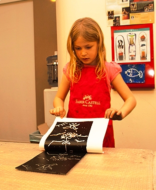 Sergi gezisinin ardından etkinliğin atölye kısmına geçen çocuklar burada sergide yer alan “Günlerin Bir Haritası” baskısından esinlenerek kendi günlerinin haritasını resmedip linol baskı tekniğiyle kumaş üzerine basacaklar.