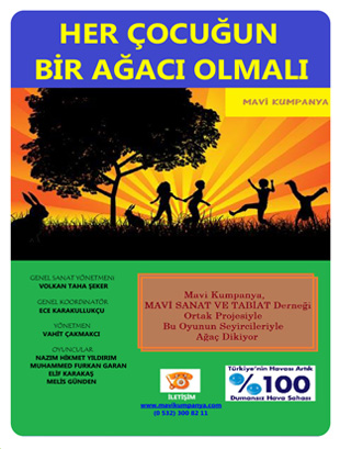 Çocuk tiyatroları kapsamında Kartal Belediyesi tarafından gerçekleştirilecek olan Her Çocuğun Bir Ağacı Olmalı, 6 yaş ve üzeri çocuklarla buluşacak. Çocuklara yeşili ve doğayı sevdiren oyun, 21 Ocak Cumartesi günü Soğanlık Kültür Merkezi’nde ücretsiz olarak sahne alacak.