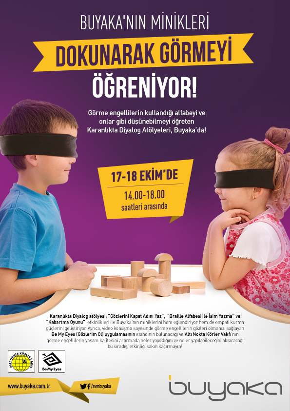 Buyaka AVM, Diologue Enterprise Pedogoji Ekibi tarafından hazırlanan görme dışındaki duyuların aktif olarak kullanabileceği “Kabartma Oyunu”, ”Gözlerini Kapat Adını Yaz” ,”Braille Alfabesi ile İsim Yazma Oyunu” atölyeleri ile çocukların görme engellilerin hayatı konusunda fikir sahibi olmalarını sağlayacak.