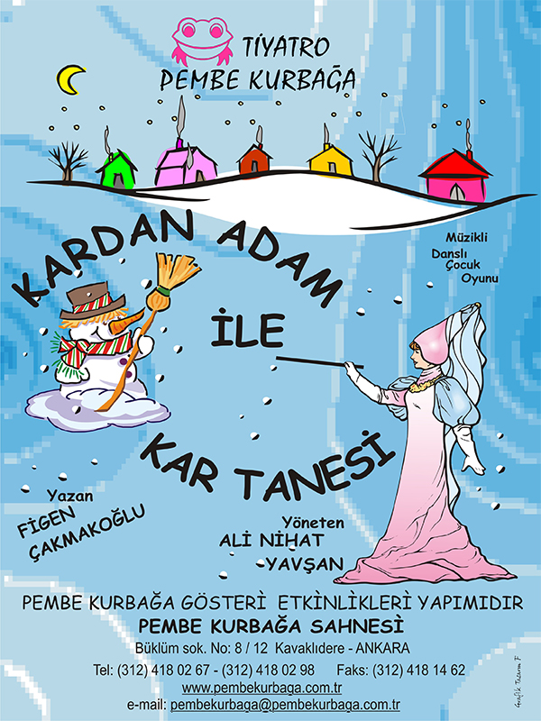 Ankara çocuk tiyatroları kapsamında gerçekleştirilecek olan Kardan Adam ile Kar Tanesi tiyatrosu Pembe Kurbağa Sahnesi’nde minik izleyicileriyle bulaşacak. Oyun, kar yağınca dışarı çıkan çocukların yaptıkları kardan adam ve kar perisi arasında geçen diyaloğu anlatacak.
