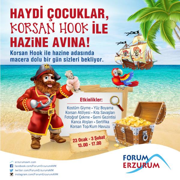 Forum Erzurum AVM, Korsak Hook ile Hazine Avı etkinliği düzenleyecek. Erzurum sömestr etkinlikleri için gerçekleştirilecek olan programda, çocuklar Korsan Hook ile Hazine Avı’na çıkacak.