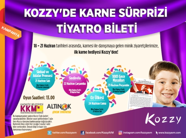 Kozzy Alışveriş Merkezi, 18 – 19 Haziran 2016 tarihleri arasında karnesi ile danışmaya gelen çocuklara karne hediyesi olarak ücretsiz tiyatro bileti hediye edecek. Çocuklar, ‘Sindirella’, ‘Sinbad ve Adalar Prensesi’, ‘Oz Ülkesi’ veya ‘Binbir Gece Masalları’ adlı tiyatro oyunlarını Kozzy AVM içerisinde yer alan Kozyatağı Kültür Merkezi’nde ücretsiz olarak izleme fırsatını yakalayacaklar.