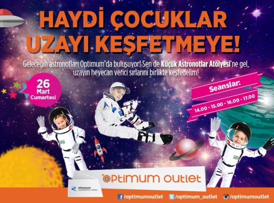 Küçük Astronatlar Atölyesi, Mart ayında İzmir Optimum Outlet Alışveriş Merkezi’nde çocuklarla buluşacak. Etkinlik kapsamında geleceğin astronotları bir araya gelecekler. Atölyede çocuklar, uzayın heyecan verici sırlarını hep beraber çözecekler.