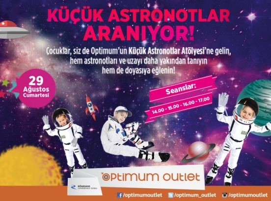 Küçük Astronotlar Atölyesi, Ağustos ayında İzmir Optimum Outlet Alışveriş Merkezi’nde çocuklarla buluşacak. Küçük Astronotlar Atölyesi ile çocuklar, astronotları ve uzayı daha yakından tanıma fırsatını yakalayacaklar. Etkinlik çocukların eğlenirken öğrenebilmesini amaçlıyor.