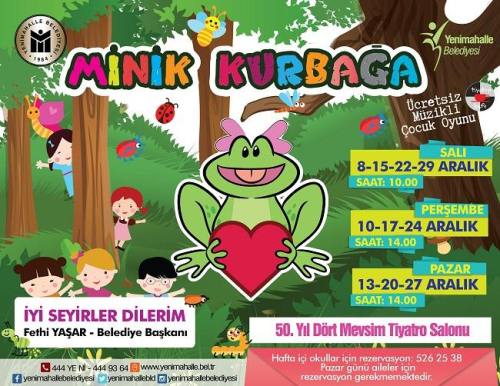 Minik Kurbağa, Aralık ayında Ankara Yeni Mahalle Nazım Hikmet Kültür Merkezi, 50. Yıl Dört Mevsim Tiyatro Salonu’nda çocuklarla buluşacak. Oyun, minik kurbağanın maceralarını müzikler eşliğinde çocuklara anlatacak.