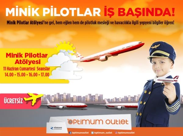 Minik Pilotlar Atölyesi, Haziran ayında İzmir Optimum Outlet Alışveriş Merkezi’nde çocuklarla buluşacak. Etkinlik kapsamında çocuklar, hem eğlenecekler hem de pilotluk mesleği ve havacılıkla ilgili yepyeni bilgiler öğrenecekler. Etkinlik, ücretsiz olarak çocuklarla gerçekleştirilecek.