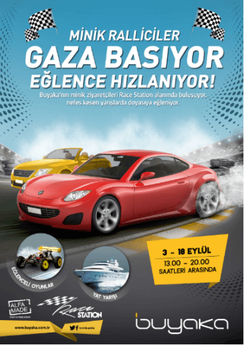 Minik Ralliciler Gaza Basıyor Eğlence Hızlanıyor, Eylül ayında Buyaka Alışveriş Merkezi Race Station’da çocuklarla buluşacak. Etkinlik kapsamında çocuklar, nefes kesen yarışlarda eğlence dolu dakikalar geçirecekler. Etkinlik 13.00-20.00 saatleri arasında çocuklarla gerçekleştirilecek.