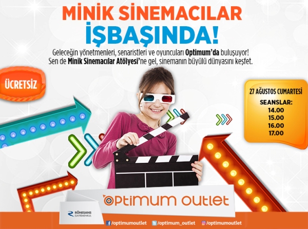 Minik Sinemacılar Atölyesi, Ağustos ayında İzmir Optimum Alışveriş Merkezi’nde çocuklarla buluşacak. Etkinlik kapsamında minik sinemacılar iş başına geçecekler. Atölye çalışması ile geleceğin yönetmenleri, senaristler ve oyuncuları bir araya gelerek sinemanın büyülü dünyasında renkli bir yolculuğa çıkacaklar. Etkinlik, ücretsiz olarak çocuklarla gerçekleştirilecek.