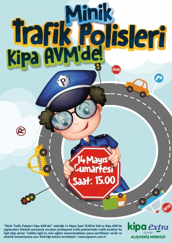 Minik Trafik Polisleri Kipa AVM’de, Mayıs ayında Edirne Kipa AVM’de çocuklarla buluşacak. Etkinlik kapsamında çocuklar, profesyonel trafik polislerinden trafik kuralları ile ilgili bilgi alacaklar. Trafik ile ilgili mini eğitimin ardından çocuklar sertifika sahibi olacaklar. Etkinlik, ücretsiz olarak çocuklarla gerçekleştirilecek.