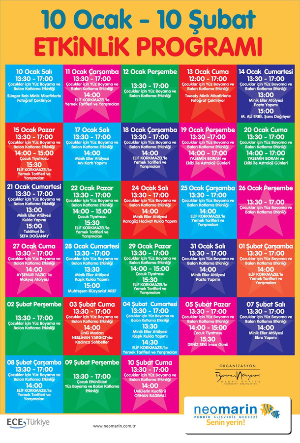 21 Ocak Cumartesi günü saat 15:00 te Yetenek Sizsiniz Yarışması birincisi Sefa Doğanay taklitleri ile Neomarin’de olacak. 22 â 25 â 29 Ocak ve 1 Şubat tarihlerinde Elif Korkmazel ile Tatlı’dan Tuzluya Pratik Yemek Tarifleri ve yarışmaları ve Çocuk Tiyatrosu, 27 Ocak Cuma günü Ayşenur Yazıcı ile Makyaj Atölyesi, 28 Ocak’ta İllüzyonist Aref’in göz kamaştırıcı İllüzyon şovu, 3 Şubat’ta ise Neslihan Yargıcı ile Kadınca Sohbetler Neomarin ziyaretçileri ile birlikte olacak.