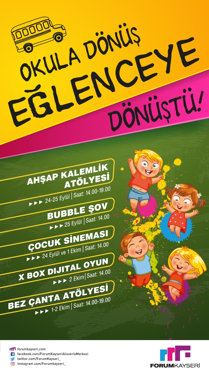 Forum Kayseri AVM, okula dönüş etkinlikleri kapsamında, çocukların hem eğlenmesi hem de kendini geliştirmesi için atölye ve çeşitli etkinlikler düzenliyor. 24 Eylül ile 1 Ekim tarihleri arasında gerçekleştirilecek olan etkinliklerde, çocuklar kalemlik atölyesi, dijital oyun, çanta atölyesi gibi programlara katılacak.