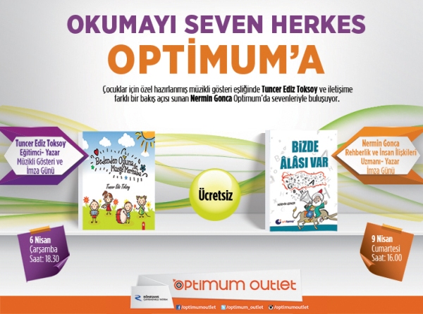 Okumayı Seven Herkes Optimum’a sloganı ile Ankara Optimum Alışveriş Merkezi Okumayı seven çocukları, onlar için özel hazırlanan müzikli gösteriye davet ediyor. Etkinlik kapsamında Yazar Tuncer Ediz Aksoy ve Nermin Gonca çocuklarla bir araya gelecek.